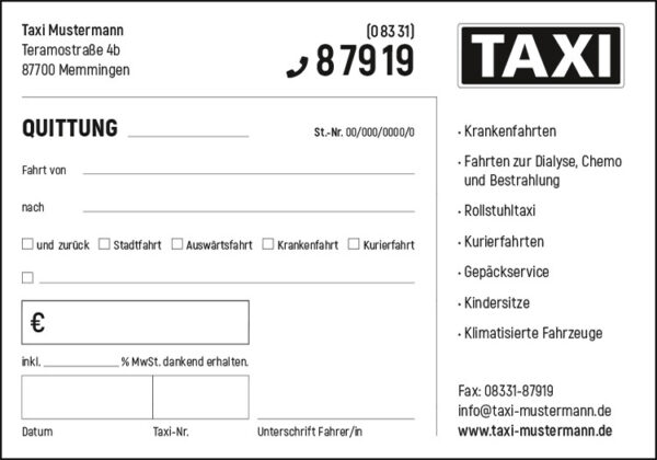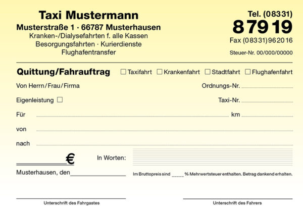 Unsere Taxi Quittungen bzw. Quittungsblรถcke sind nach Ihren Vorstellungen bedruckbar.